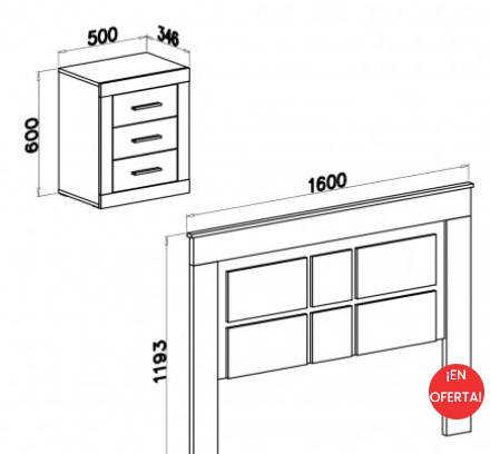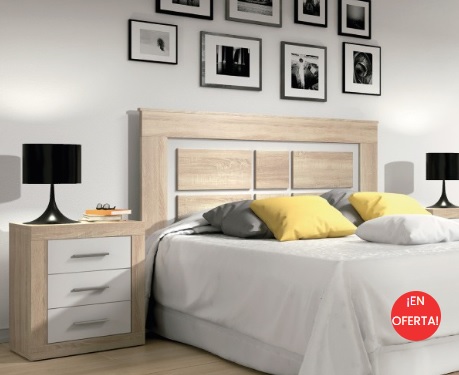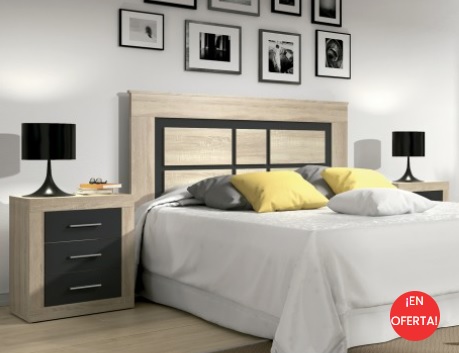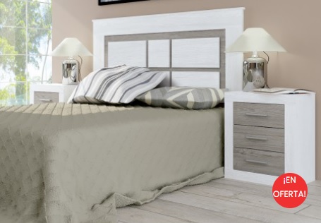 Moderno dormitorio compuesto por dos mesitas con marco y tres cajones y un cabecero con plafones. Se puede adquirir opcionalmente la cómoda y el marco espejo de la misma serie en el catálogo de nuestra página, además de otros modelos de cabeceros a juego.