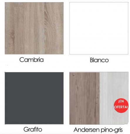 También disponemos de armarios tanto de puertas abatibles como de puertas correderas ideales para este catálogo de dormitorios. Se puede adquirir el dormitorio en tres colores diferentes: andersen pino-gris, cambria-blanco y cambria-grafito