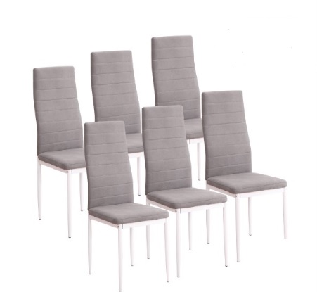 La silla modelo Yuri destaca por su precio y su diseño, si busca un modelo barato pero con todas las características de una silla de calidad la silla Yuri es perfecta. Las sillas tienen el respaldo y el asiento tapizado en tela jarama color marengo y las patas son metálicas acabadas con pintura electrostática en color negro o blanco. Las sillas tienen un diseño moderno y ergonómico, permitiendo una sentada cómoda y confortable. Se venden en juegos de 6 sillas. Se pueden combinar con cualquier mesa de cristal.